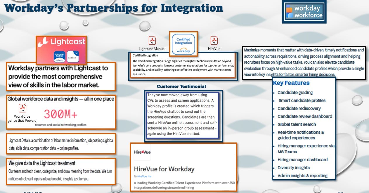 Workday markets these capabilities through its Skills Cloud and HiredScore integrations, which are built atop LLM infrastructure and available to: