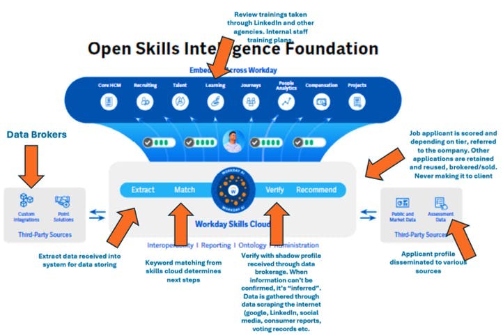 This data is routinely shared between brokers like Lightcast.io, People Data Labs, Acxiom, and platforms like Workday, SAP SuccessFactors, and Oracle HCM Cloud, where it is used to construct AI-based hiring decisions without notification or transparency to the job seeker.